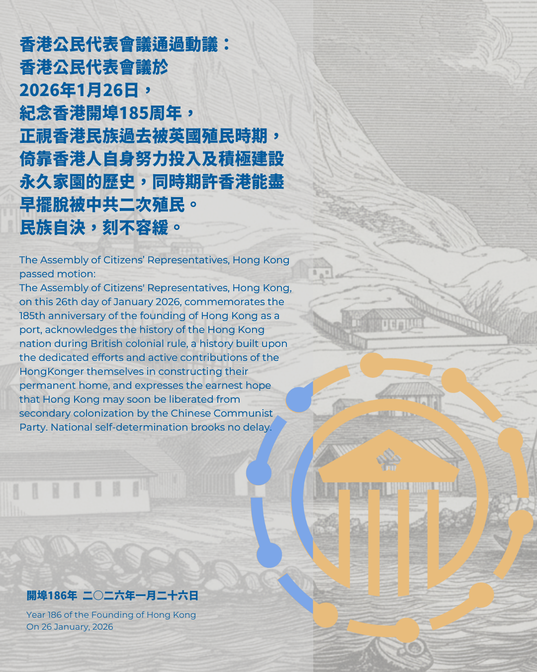 The Assembly of Citizens’ Representatives, Hong Kong, on this 26th day of January 2026, commemorates the 185th anniversary of the founding of Hong Kong as a port, acknowledges the history of the Hong Kong nation during British colonial rule, a history built upon the dedicated efforts and active contributions of the HongKonger themselves in constructing their permanent home, and expresses the earnest hope that Hong Kong may soon be liberated from secondary colonization by the Chinese Communist Party.